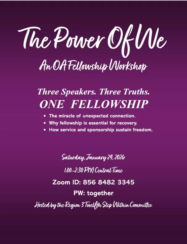 « All Events Virtual Event This event has passed. OA Fellowship Workshop | The Power of We Virtual Event January 24 @ 1:00 pm – 2:30 pm The Power of We | OA Fellowship Workshop OA Region 3 Twelfth Step Within Committee r3tswcommittee@oaregion3.org Add to calendar Google Calendar iCalendar Outlook 365 Outlook Live